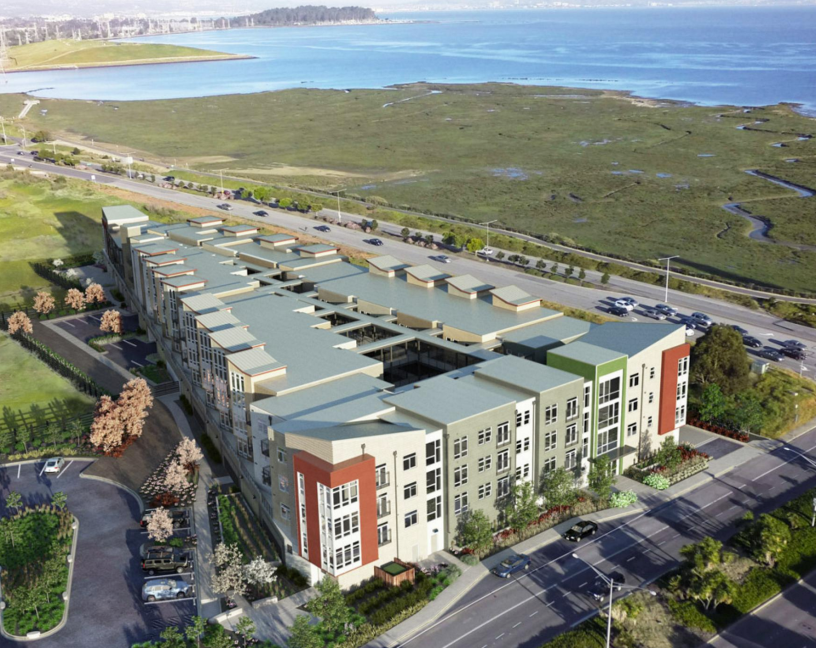 Tidelands這個新公寓位在San Mateo, 是由The New Home Company建商所建. 建築物從空中看是三角型像是一塊派, 一共四層樓, 第一層是停車場, 一共有七十六戶, 尺寸從七百八十到一千六百平方英尺, 從一房一衛到三房二衛, 價格從七十六萬到一百五十萬美金, 每月管理費從四百多到六百多不等. 房價包含一切電器和地板, 入住時間預定在今年的十一月底或二十月初.
