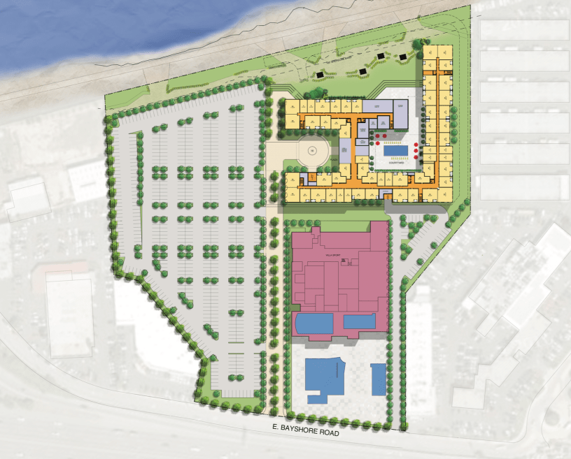 “The Bay frontage is a prime opportunity to bring the natural environment into the site while creating a strong connection to the neighborhood,” wrote Jonathan Ennis, president BDE Architecture, in a letter regarding the project. “The intent is to integrate native planting throughout the project and look for opportunities to add to the restoration of the Bay frontage. This project will embrace pedestrian and bicycle circulation around and through the site, creating linkages between VillaSport and the new, as well as the existing, residential units. The development pulls back from the Bay frontage in order to provide gathering spaces and platforms to experience nature allowing for the neighboring communities to connect.”