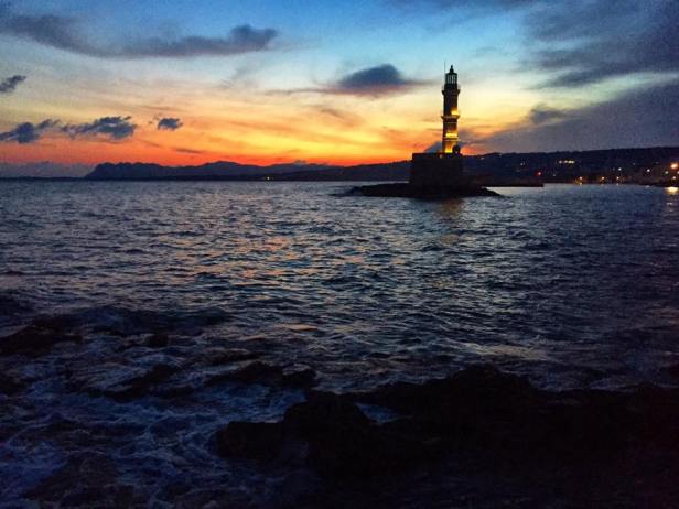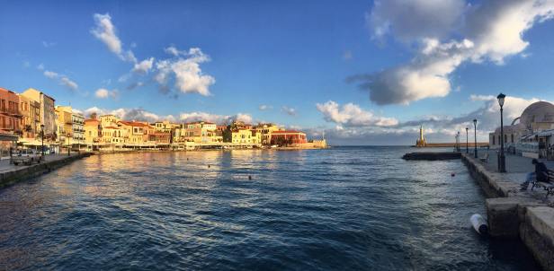 我們從德菲爾回雅典機場飛哈尼亞市, 拿到租車開到位於老城區的旅館後, 再去找停車位時已經快晚上八點, 等稍加安頓後去附近吃飯已晚, 不過看到美麗的景色, 挺療癒的.