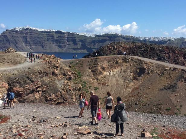 第二天一早我們搭船去參觀位在愛情海中, 無人居住的火山島The National Geological Park of Nea Kameni – 坐飯店接駁車到四歐元坐纜車下去到港口 (你也可以選擇走五百多階的樓梯下去), 買船票 (不同船, 價格不同), 火山島門票四歐元, 停留約一個小時多一點, 步行參觀五個火山口. (火山口 by 阿龍 ; 前往黑火山島 by 珮詩)