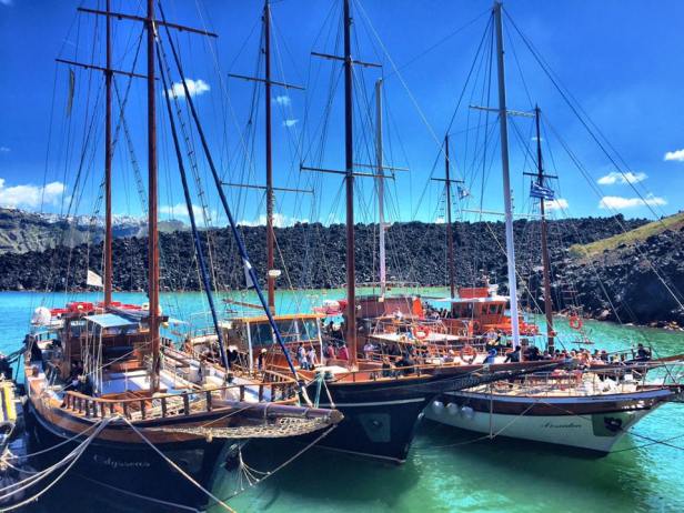 第二天一早我們搭船去參觀位在愛情海中, 無人居住的火山島The National Geological Park of Nea Kameni – 坐飯店接駁車到四歐元坐纜車下去到港口 (你也可以選擇走五百多階的樓梯下去), 買船票 (不同船, 價格不同), 火山島門票四歐元, 停留約一個小時多一點, 步行參觀五個火山口. (火山口 by 阿龍 ; 前往黑火山島 by 珮詩)