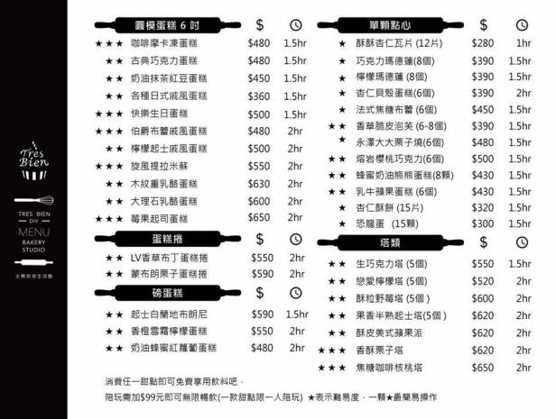 費用就看你選的是哪一項甜點, 每種甜點有不同的難易程度和所需的時間, 比較難的需要比較久的時間, 所以費用就高一些. 教室裡的器具應有盡有, 大家選擇自己想做的項目, 現場有數位助教隨時幫忙. 現場還有免費的飲料, 咖啡, 茶供你享用.