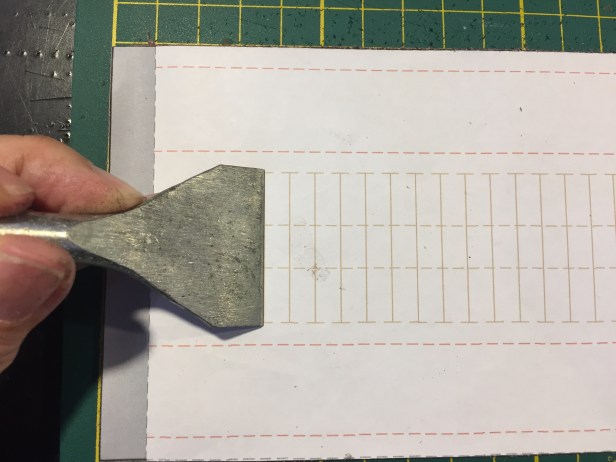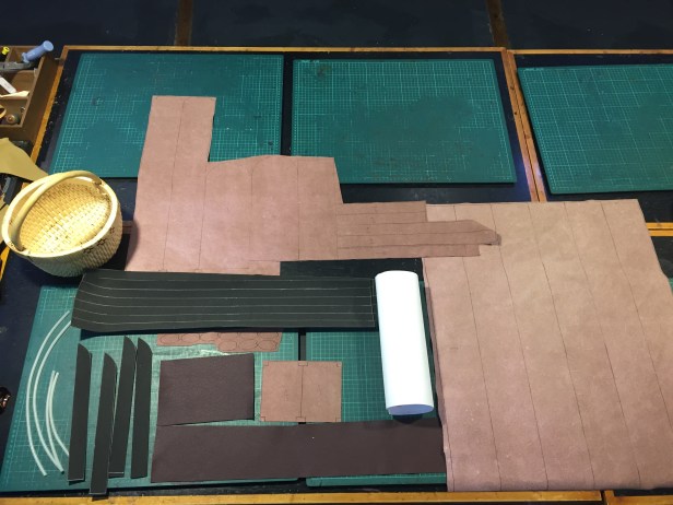 第一次上課, 我從開門做到關門 (12:00 – 9:00). 二堂有幾個地方與手作星球不同 – 二堂把尺寸畫在皮革上, 連同紙型, 都是你自己裁剪 (花時間); 紙型尺寸和皮革相同, 所以是用噴膠的方式, 把紙型黏在皮的背面上 (事後要撕, 略嫌麻煩); 許多皮條要對黏, 敲平後再處理皮條邊緣 (不知道整塊布對黏後, 再裁成皮條會不會省事些).