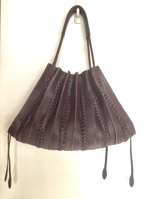 我是外皮酒紅色, 內裡布紅色, 搭配棗紅色的邊油和線. 我一共去了十次, 但是並不是每次都待滿九個小時, 所以實際待在教室的時間大概是50小時 (不含在家做的時間). 這個包在手續上真的比較繁瑣, 很多縫線洞要打, 要手縫, 接縫處理, 上邊油.