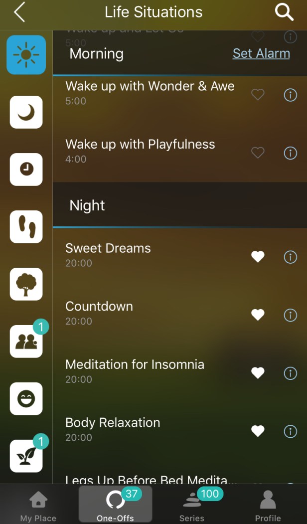 Inside of the Life Situations, it has Morning, Night, Pressed for Time, On the Go, Breethers, Relationships, Happiness, Life, Personal Growth, Health & Wellness, Workplace, Performance & Success, Stress & Anxiety, Spiritual, Relaxation, total of 15 sessions. From Wake up with Intention/Gratitude/Energy/Confident, to Transition to Sleep Meditation, Dealing with Confrontation, Loving Yourself, Finding the Ideal Job, Coping with Grief, Managing PMS, Weight Loss, Master your Memory, etc.