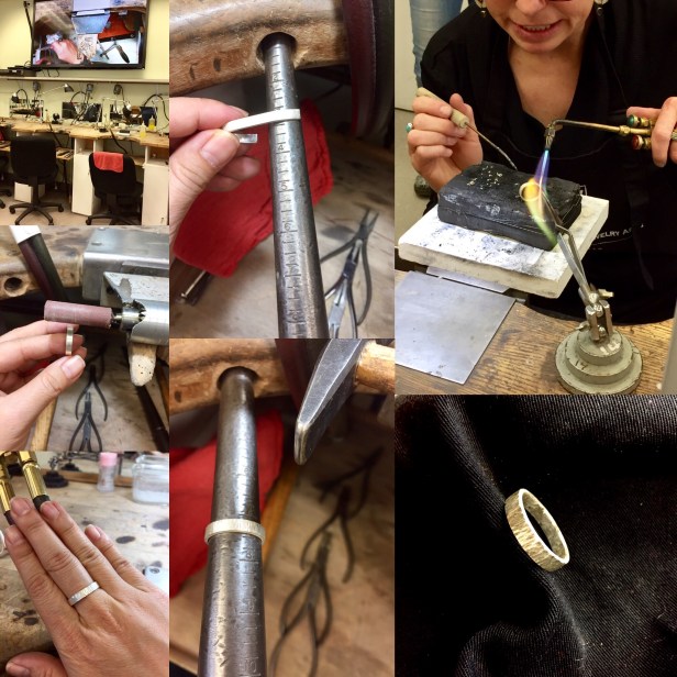 我的第一個手工首飾是在2017年, 我去舊金山上了一堂課, 他有三件首飾讓我們選 – 戒指, 耳環, 和項鍊墜子. 我選擇銀戒子. 因為只有一堂課, 學校把很多步驟都做好了, 節省時間.