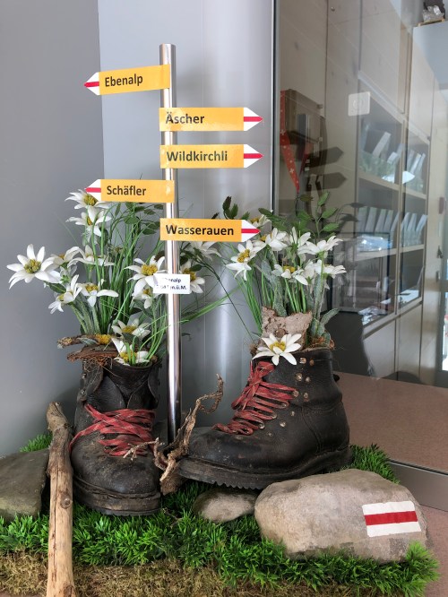 7/24 (D6): 今天去Ebenalp坐纜車上山, 然後走一段路去看國家地理雜誌報導的一家延著山壁蓋的餐廳Äscher, 並在這裡享用一頓意外美味的午餐 (Homemade cheese tart with Appenzeller cheese, leek and onions, AND Creamy barley soup with dark bread, stripes of air-dried meat); 一個很特別的山洞, 然後去Appenzell, 一個很有趣的小鎮.
