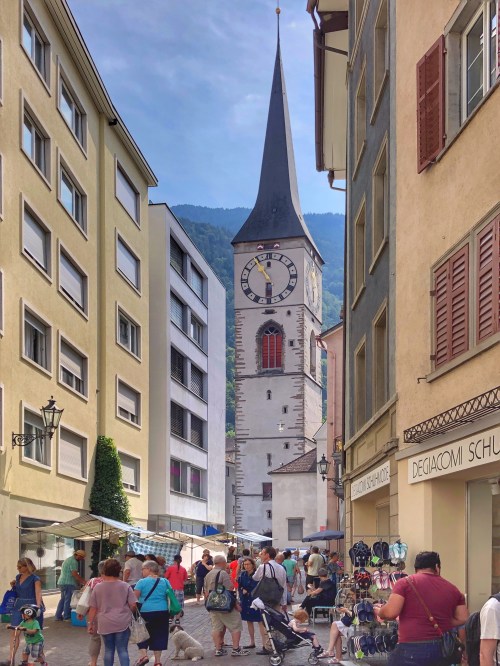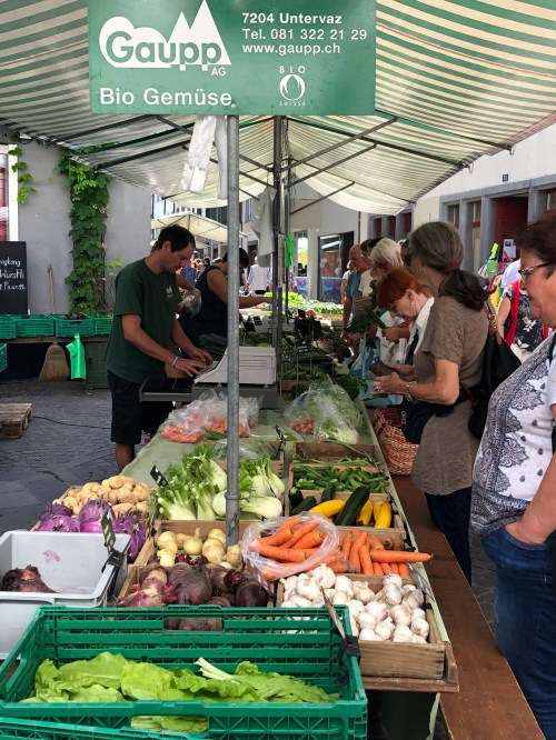 7/20 (D2): Chur 週六上午8-12點有農夫市場, 有很多當地做的Cheeses, Dried Meat, Butter, Honey, Jam. 今早剛好遇到週六, 就去農夫市場逛逛, 順便調時差.