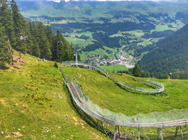 7/21 (D3): Toboggan adventure mountain Pradaschier in Churwalden – 它長達3,060米(31個彎和480米的高度差),從海拔1,750米的起點到山谷,行程持續7到10分鐘,達到40公里/小時的速度,是瑞士最長的滑道 。如果你事先定好公車票和Chairlift (纜車) + Toboggan Run (滑軌車)的票, 後者可以享有八折優惠.