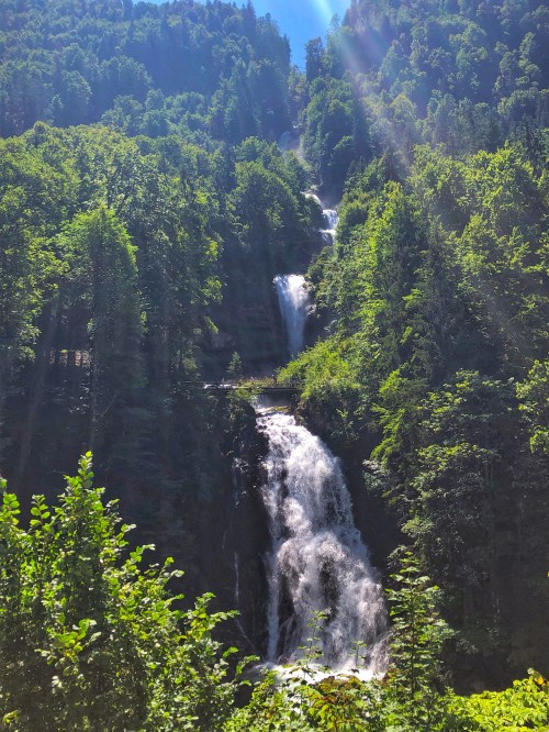 The amount of water in the falls varies greatly. From December to March there is just a little stream trickling down under thick sheets of ice. After frosty nights in April and October the flow of water measures only a few dozen liters a second. But between April and June, when the snow melts, and between June and September, when the glacier ice melts, as well as after heavy rain and thunderstorms, as much as 20’000 liters a second may come thundering through the rocky defile. The little stream becomes a mighty river.