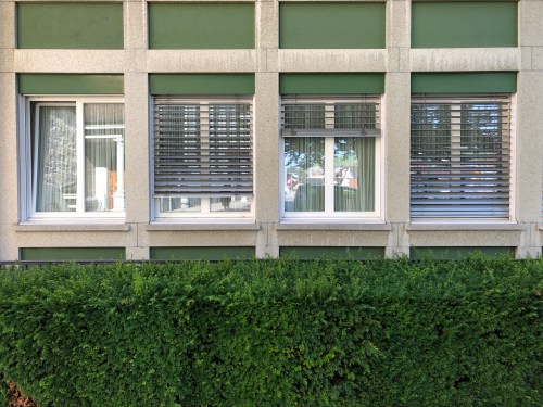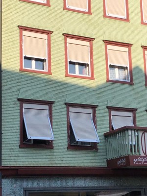 瑞士在窗戶的防曬隔熱上,有幾種選擇,但都在窗戶外面,因為要將熱氣在碰到玻璃窗之前就阻絕。常見的百葉窗應該是鋁製, 有很多種顏色可以選.