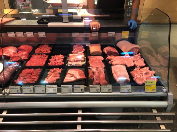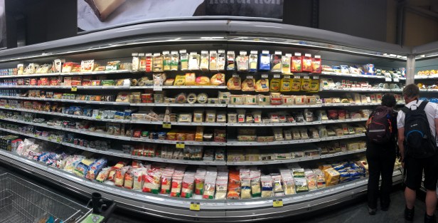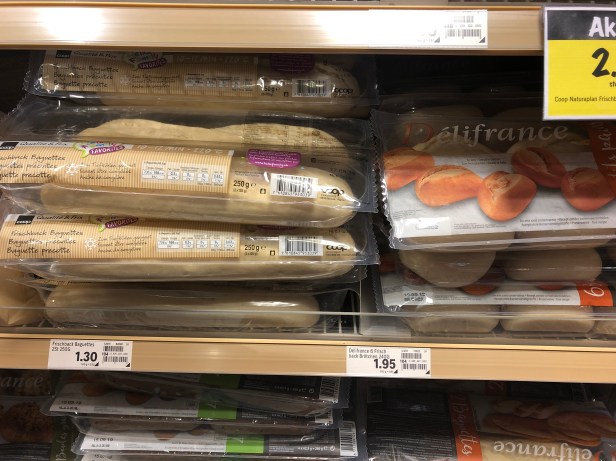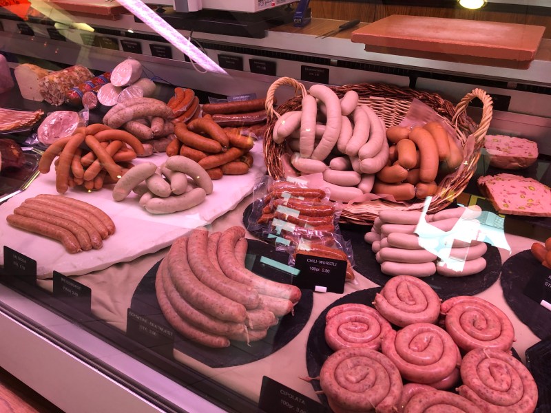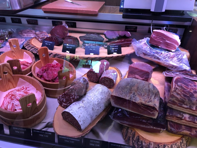 超市裡的Cheeses, Dried Meat, Sausages, Butter, Yogurt, Bread, 等等有許多不同口味的選擇, 有些肉類也是美國超市比較少見的, 例如兔肉, 鹿肉, 鴕鳥肉, 豬肝等等. 不過瑞士的紅肉價格很高, 即便是當地有飼養牛隻.