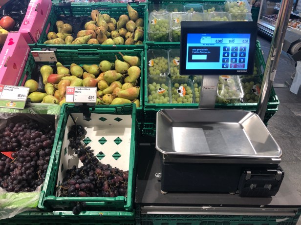 在瑞士超市買東西, 散裝的蔬菜水果要自己秤重貼好價格標籤, 每個散裝物都有號碼 (標籤左上角那個紅色的三位數字號碼), 然後機器右下角就會跑出價格標籤.