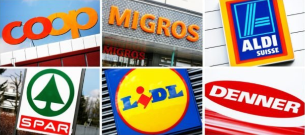 瑞士的超市以Migros和Coop二家為主, 到處都有他們的蹤跡. ALDI 和 LIDL (來自德國), SPAR (來自奧地利)則是新的競爭者 (前二家也開始進入美國市場) (Migros買下Denner).