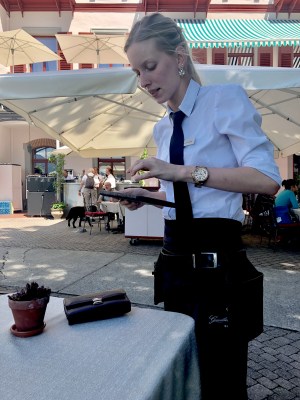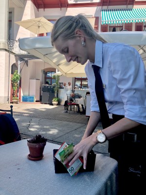 服務生腰帶上都會掛著一個很厚的大皮夾, 裡面全是各種幣值的鈔票和銅板, 當你告知要結帳, 如果刷卡, 他們把刷卡機帶到你面前, 如果付現, 他們就會拿出那個大皮夾, 當場找錢給你 (他們的心算比美國人好太多了).