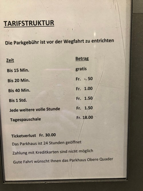 在瑞士, 停車通常要付費 (Pay Station), 即便是去超市買菜或觀光園區景點內的停車場都一樣, 費用雖然不是很高 (一小時大概一塊到一塊半瑞士法郎), 但累積下來也是很可觀.