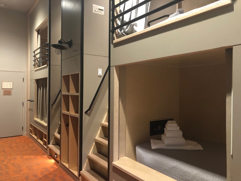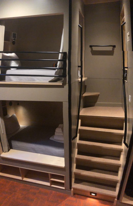 我這次選最便宜的PODS (Share Bathrooms), 整棟PODS Dorm有幾間房我不是很確定, 不過每間房有八個Pods, 上層床號是雙數 (天花板較高, 樓梯窄小, 感覺較隱密), 下層床號是單數. 我建議選靠窗這頭, 因為房門開關很大聲. 房間內沒有電視或電話, 但有WIFI.