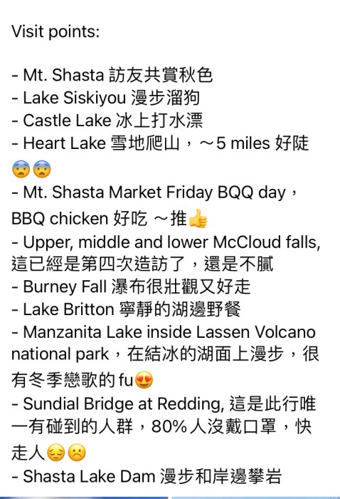 後記: 以下是我另外一位朋友去雪士達山玩的景點