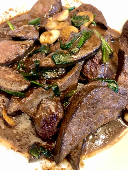 平常在華人超市只看過雞肝的我, 今天突然看到豬肝, 本來不想買 (因為不會做), 上車準備離開前, 上網看了一些食譜 (看到新葉餐廳的香煎豬肝), 有點心動, 結果又下車進超市買豬肝, 回家上網把各個食譜仔細研究一下, 看了幾個影片, 傍晚就下廚, 做了這一大盤 “香煎豬肝”, 大陸室友很捧場, 吃了半盤 (感謝她), 味道不錯, 但是從清洗, 修剪, 過油, 烹煮的整套手續太麻煩了, 自己這樣做過一次後就懂得感謝, 並甘願花錢去餐廳吃了.