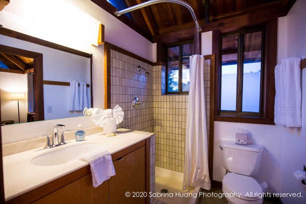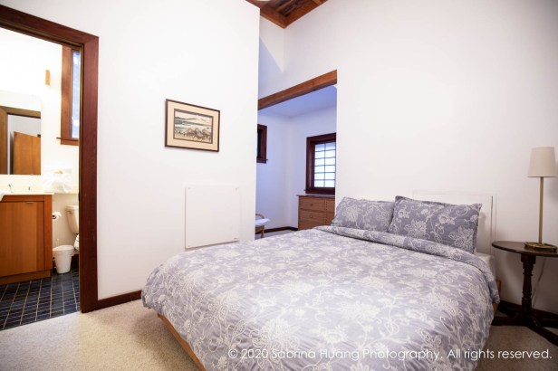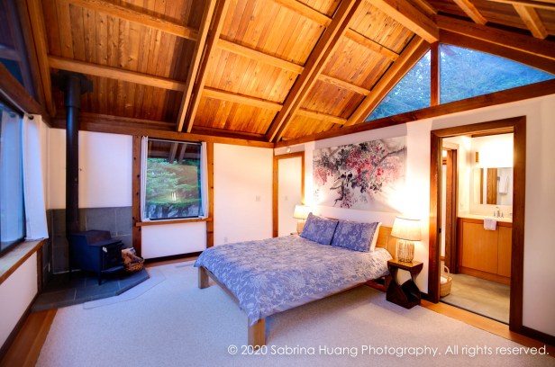 Hinoki House has wifi but no cellphone signal with 2 bedrooms and 2 bathrooms – Master queen has a full bathroom with shower, a walk-in closet with hangers, and a cast iron wood burning stove upstairs, and a double bedroom with a kind of “Jack & Jill” bathroom (has two doors, share with guests) downstairs. They have a hairdryer, body soap, hand soap, and towels.