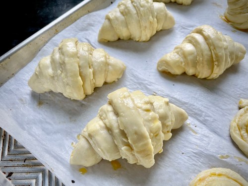 11. Put the croissants on the prepared baking trays, leaving space in between them to expand; allow 4 – 6 per tray. Put each tray inside a clean plastic bag and leave the croissants to rise at cool room temperature (18 – 24°C) until at least doubled in size. This should take about 2 hours. (*after one hour, I put 6 unbaked croissants into the freezer for later)