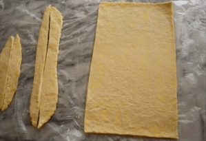 8. Put the dough on a lightly floured surface and roll out to a rectangle, a little more than 42cm long and 30cm wide; it should be about 7mm thick. Trim the edges to neaten them.