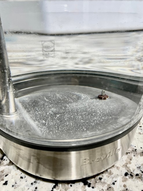 After using the Berkey filter for a few weeks, I noticed that the hard water stain been left in the bottom of the electric glass kettle again, as well as some white stuff floating on the top. This only happens after I boiled the water.