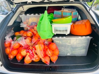 出發前一天去採買, 主角是有機芹菜, 先去Costco, 買了蘋果, 葡萄柚, 檸檬和西瓜, 但因為它賣的是有機芹菜心, 量少有貴, 所以接著再去Whole Foods, Trader Joe’s, Sprouts 找, 但是量太少, 所以最後跑了四家Safeway才買齊六人份的有機芹菜和小黃瓜. 我們的行李, 相關器具, 三張按摩床, 加上所有的蔬果, 也是塞滿了二台車, 塞爆了冰箱.