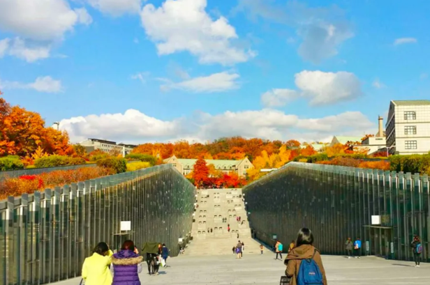 大峽谷般壯麗的梨大校園「ECC」,在秋天前來,背景的林蔭都會變成鮮紅、燦爛的暖色系,看起來非常精緻,也是一年四季中,梨大校園最美麗的時刻。