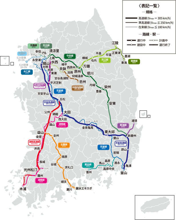 截至2012年9月底,韓國鐵路系統共有90條鐵路線。2004年,京釜高速線的開通開始了韓國的高速鐵路(KTX)時代。繼日本、法國、德國和西班牙之後,韓國成為世界上第5個擁有高速鐵路的國家。韓國高鐵設定時速為每小時350公里,實際執行速度最高可達每小時300公里。從首爾至釜山乘韓國高鐵僅需2小時40分。韓國高鐵將高速公路形成的「一日生活圈」變成了「半日生活圈」,即半日內可到達韓國主要地區。