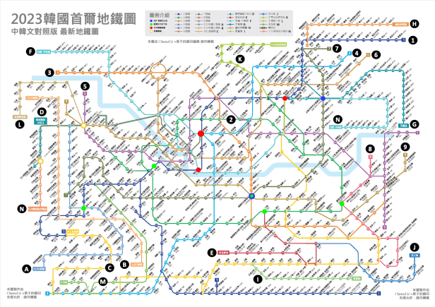 首爾的地鐵有19條路線 (主線的1-9號線 + 支線的A-N線),超過700個站,所以我光看地鐵地圖就眼花了,好在有人佛心的整理出中韓文對照的最新2023地鐵圖方便讀者對照,而且還清楚的分類和標示重要站名 (高鐵站KTX, 高速巴士站,五大地下街,二個機場地鐵站),請點果子的腳印去下載。 這個網站還提供首爾探索卡 (Discover Seoul Pass) 的優惠價喔!!!