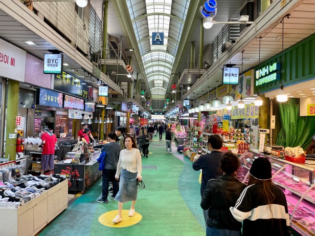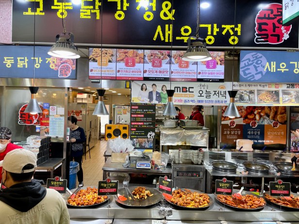 週六早上有下雨,我們先去Seoul Central Market (Jungang Market)/Flea Market,中午吃這家有名的辣炒年糕,因為他也不吃辣,所以我們叫不辣的,但實際上還是有一點點辣,不過我還能承受(多喝果汁)。