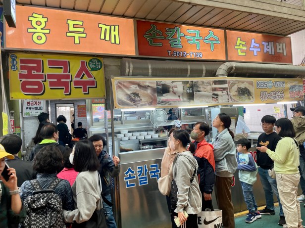 第一位地陪Amy,我先預約一天,去仁寺洞、弘大、延南洞。11:00在江南地鐵站出口見面,她先帶我去吃刀削麵當午餐,她點魚卵刀削麵 (特色),但我不吃辣,所以我點鮮蝦刀削麵,搭配一盤豬肉,白飯是免費的,可以自己去盛飯。
