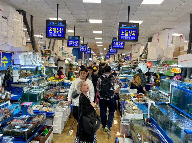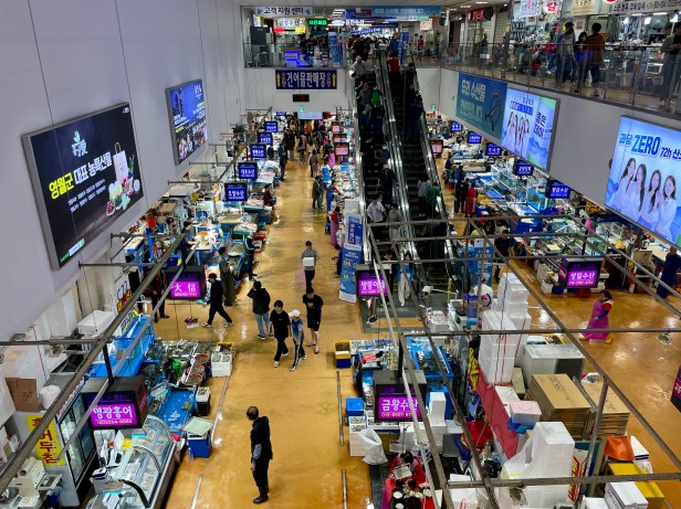 鷺梁津水產市場,可以買新鮮魚貨,然後拿去樓上的餐廳幫你做好享用,你看海膽的價錢不到美金二十塊啊。
