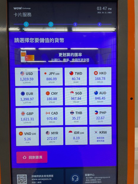 後來在梨泰院的遊客中心旁邊看到一台WOWPASS機器,就順便存了一千塊台幣進去,順便拍一下匯率表,很多飯店大廳和地鐵站都有WOWPASS機器,匯率比機場銀行好,但比換錢所差一點,就看需求囉。