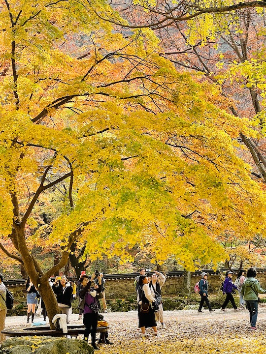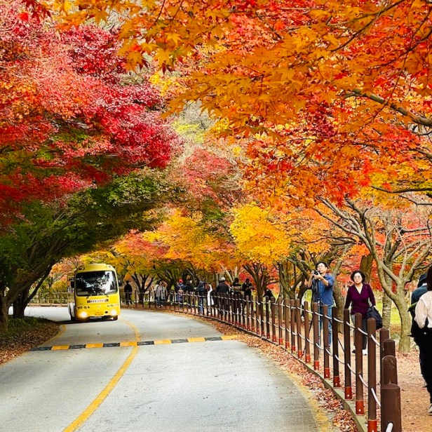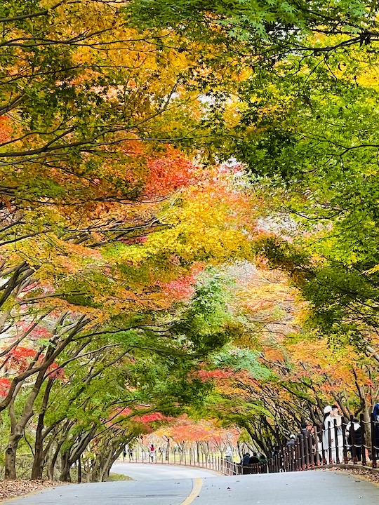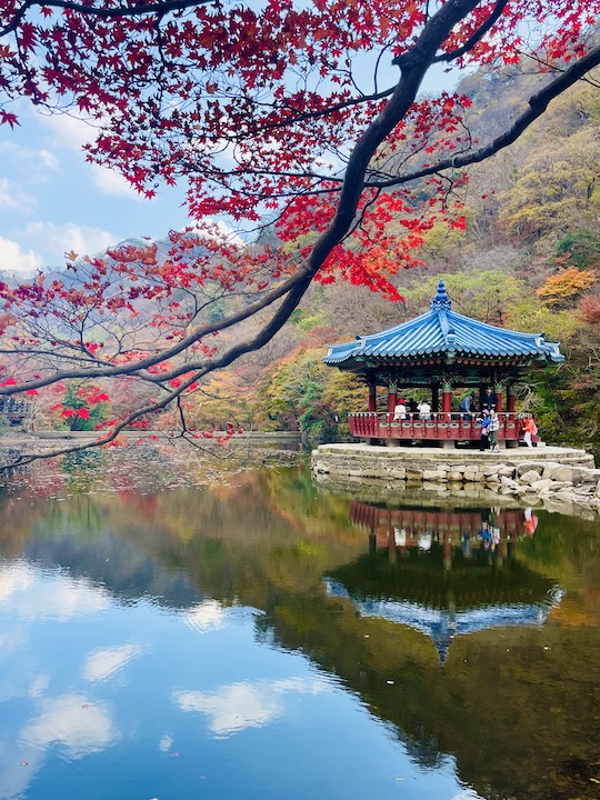 沿著楓葉隧道散步下山,快到纜車乘車處前會經過韓式風格的羽化亭,這個以楓葉倒映在湖面上的景色聞名的景點。我到的那天在羽化亭附近的楓葉其實掉的差不多了,我真的是找了很久,才找到這一個角度拍進一點點僅存的楓葉啊。