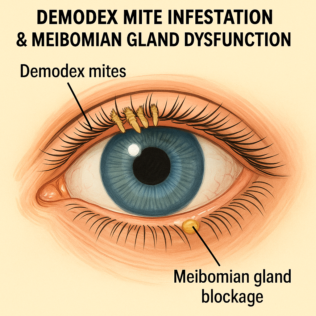 乾眼症成因主要分為淚液分泌量不足的缺水型乾眼症,以及淚液蒸發過快的蒸發型乾眼症; 而蠕形蟎蟲分毛囊蠕形蟎蟲及皮脂蠕形蟎蟲兩種。前者寄生於毛囊中;後者則寄生於瞼板腺與皮脂腺周圍,在健康的眼瞼環境也可能有少量的蟎蟲寄生,但並不會造成傷害。然而油性膚質、免疫力低下的人,容易因毛囊蠕形蟎蟲吞食人體皮膚細胞,造成毛囊腫大發炎,刺激上皮增生及角質化、睫毛根部皮屑聚集,睫毛也容易脫落或稀疏。皮脂蠕形蟎蟲則容易造成瞼板腺體阻塞、萎縮,導致腺體無法順利分泌淚液中的油脂成分,嚴重者還會演變成缺油性的乾眼症。另外蠕型蟎蟲也會寄生在臉部皮膚並誘發玫瑰斑(酒糟),造成臉部泛紅,搔癢甚至反覆長丘疹膿包等症狀。……..比我想像中的嚴重啊。