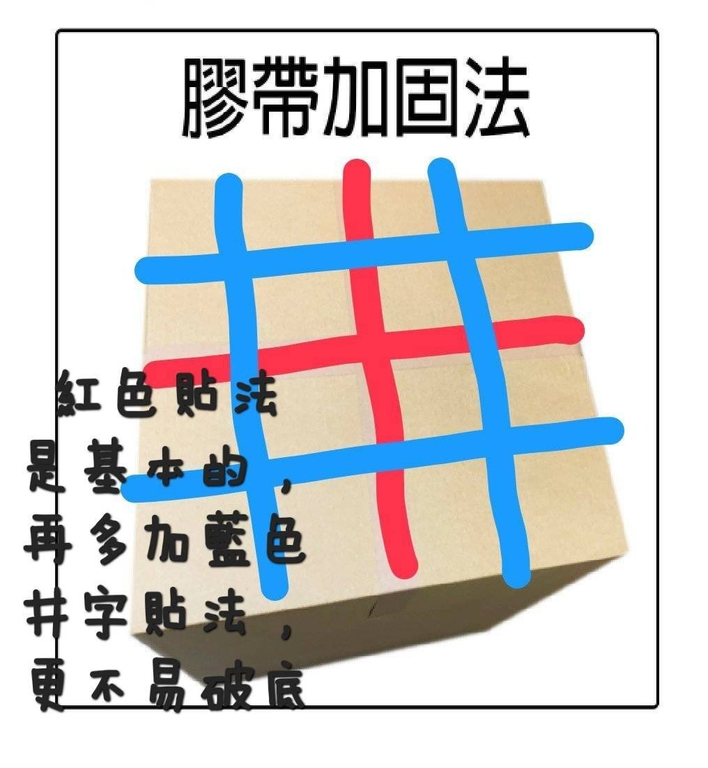 我的紙箱外層底部,基本上是用膠帶整個貼滿,確保不會因為潮濕而破底。紙箱所有的邊都貼膠布,確保不會裂開破損。紙箱的大面積都以紅加藍的井字貼膠帶,總之用了很多膠帶。
