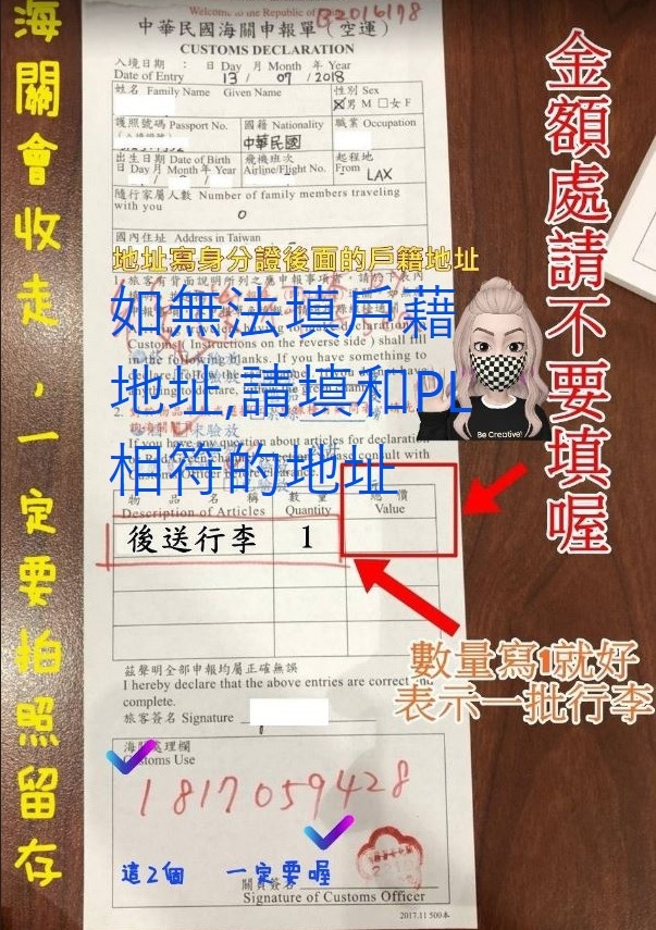- 然後要記得拍機票存根、有入境章那整頁拍照,連同申報單,將這三張照片回傳給海運公司經手人。