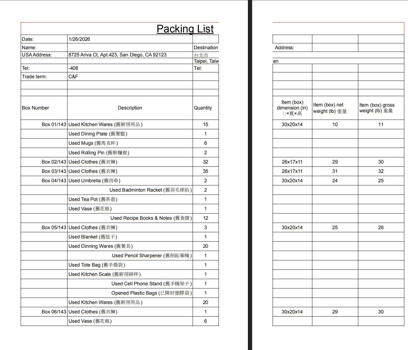 裝箱明細是有點嚇人啊,要仔細列出每一種物品的數量。我裝完六箱後才知道要這麼詳細,所以又得重新來過。我給自己二個月的時間搬家,感覺時間不夠用啊。